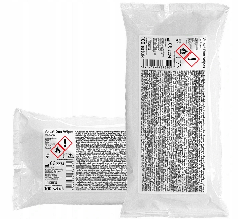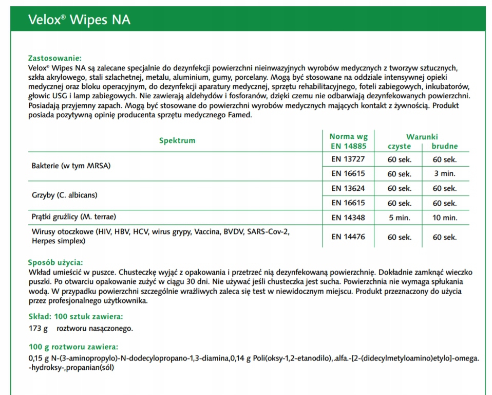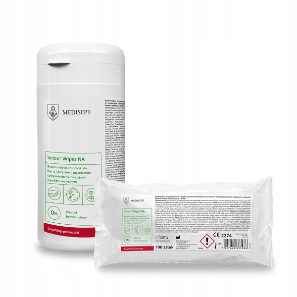 Chusteczki Velox NA zalecane są do dezynfekcji różnorodnych powierzchni sprzętu medycznego ze szkła, porcelany, metalu, gumy, tworzyw sztucznych oraz szkła akrylowego.