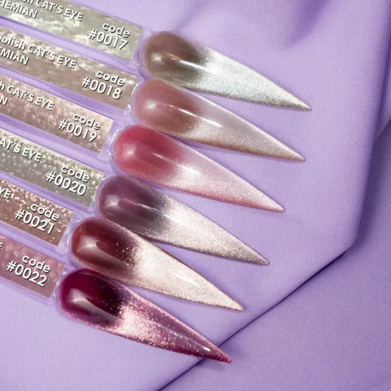 Każdy odcień Bohemian Cat Eye zawiera miliony maleńkich drobinek metalu, które doskonale reagują na działanie magnesu, pozwalając na tworzenie indywidualnych wzorów pełnych hipnotyzującej elegancji. Wysoko napigmentowane lakiery zapewniają idealne krycie bez konieczności stosowania dodatkowych produktów, skracając cenny czas w salonie.