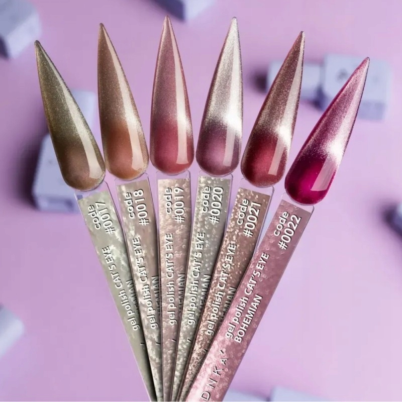 Kolekcja Color Gel Bohemian Cat Eye marki DNKa to seria 12 wyjątkowych odcieni, w których elegancja spotyka się z magnetycznym efektem kociego oka. Te niezwykłe lakiery hybrydowe pozwalają uzyskać zachwycające stylizacje o subtelnym, krystalicznym połysku oraz głębi, która zmienia się wraz z kątem padania światła, przywodząc na myśl blask kamieni szlachetnych.