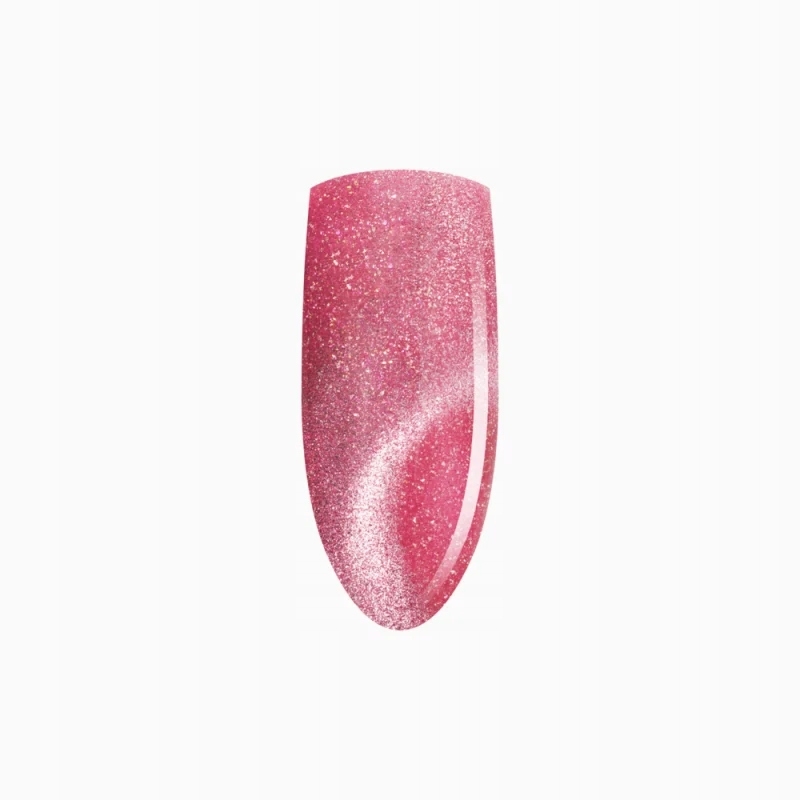 W tym lakierze drobinki są kluczowe: złote i różowe refleksy odbijają światło i budują wielowymiarowość. Wykończenie cat eye dodaje magnetyczny akcent, który porządkuje błysk i tworzy charakterystyczną smugę. Efekt wygląda spójnie i profesjonalnie, bo refleks ma kierunek, a nie rozkłada się przypadkowo.