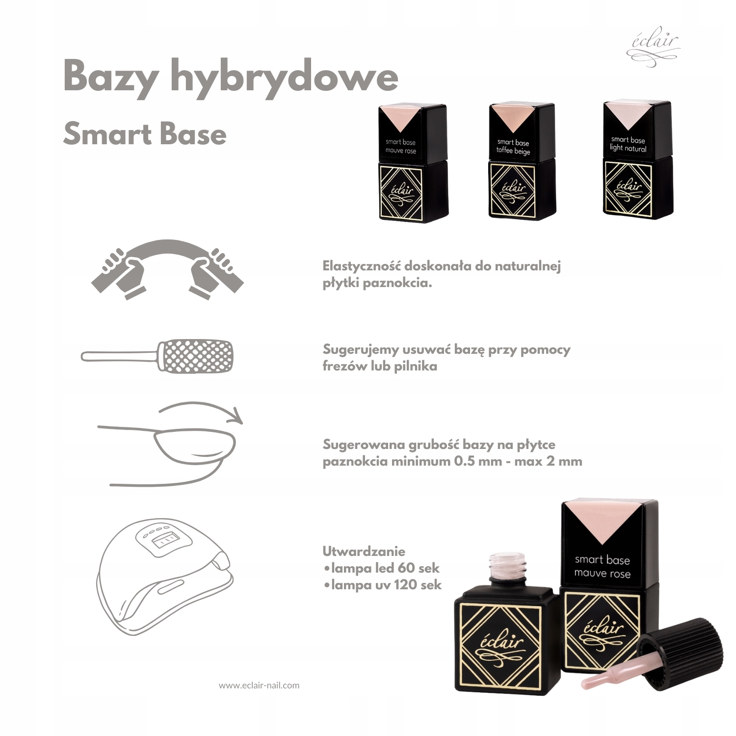 W nude liczą się detale: jednolitość powierzchni, estetyczne krycie i wrażenie idealnie gładkiej płytki. Smart Base MAUVE ROSE 7ml delikatnie maskuje drobne niedoskonałości paznokci, optycznie poprawiając ich wygląd i wspierając estetyczną spójność stylizacji. Jednocześnie baza wzmacnia naturalną płytkę, co przekłada się na bardziej „stabilny” efekt wizualny – paznokcie wyglądają na zadbane i uporządkowane, bez wrażenia ciężkości.