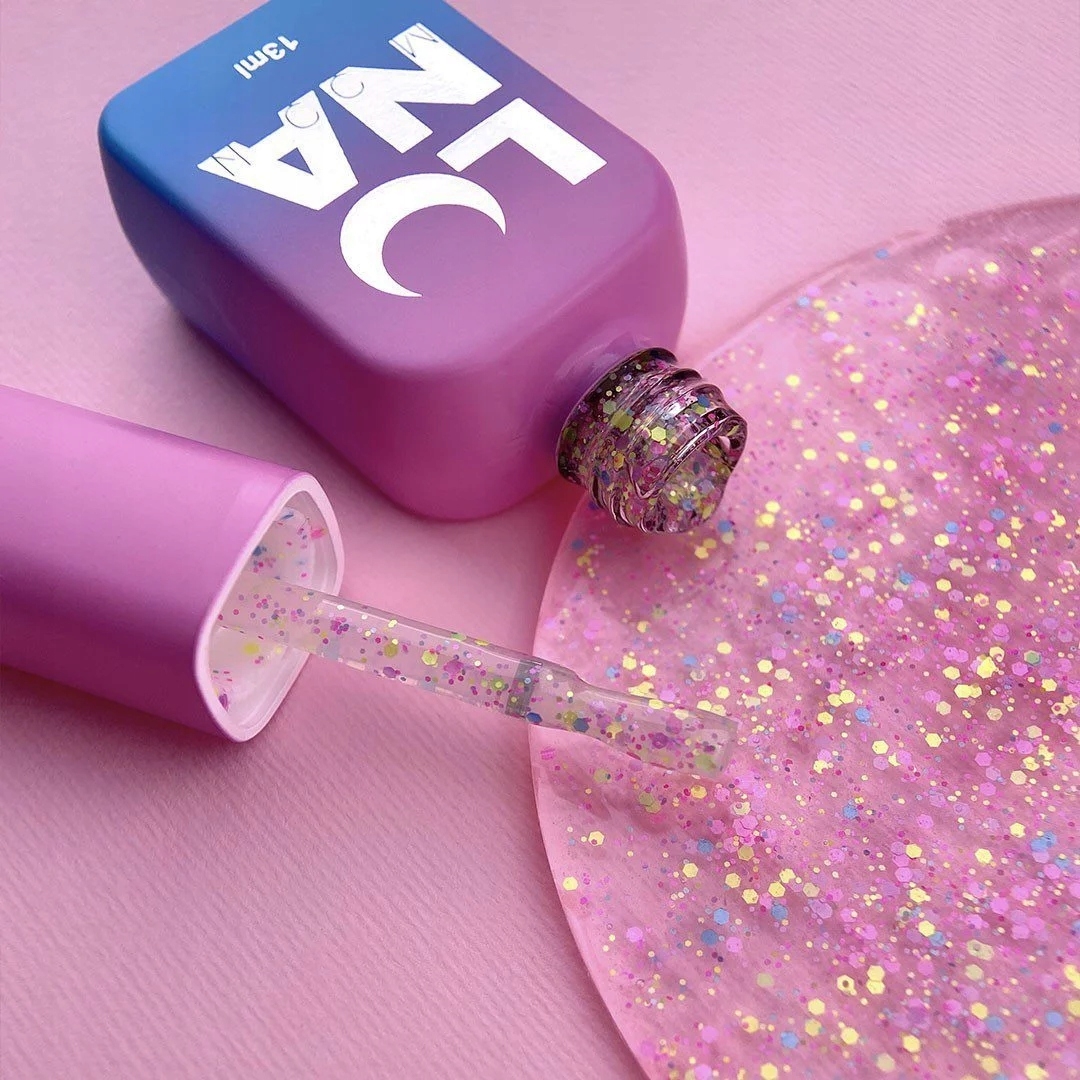 Top hybrydowy Luna Confetti – top z różnokolorowymi figurkami, bez lepkiej warstwy, która będzie wyglądać harmonijnie z dowolnym kolorem na paznokciach. Jest w stanie sprawić, że twój manicure będzie interesujący i niezwykły.