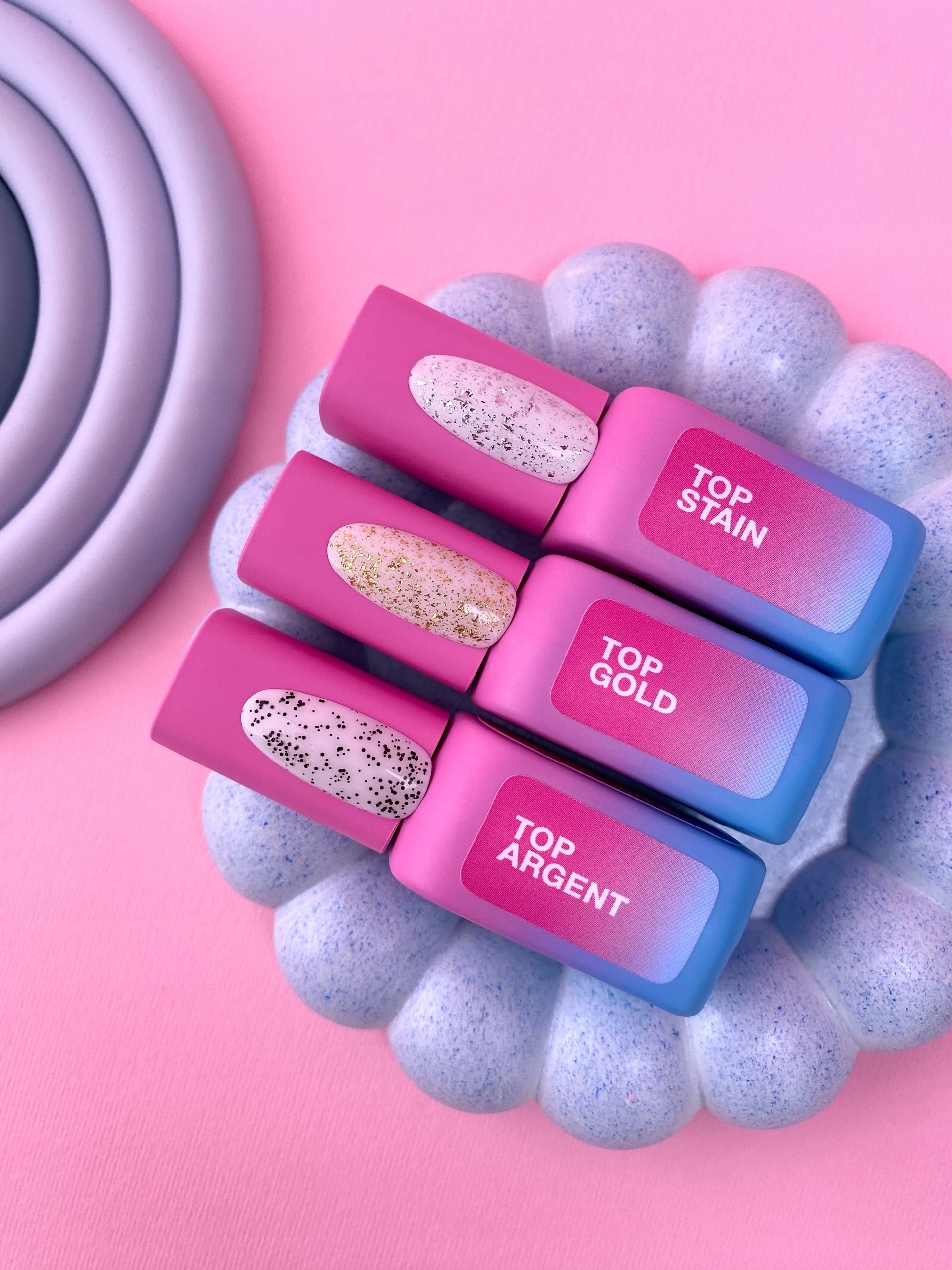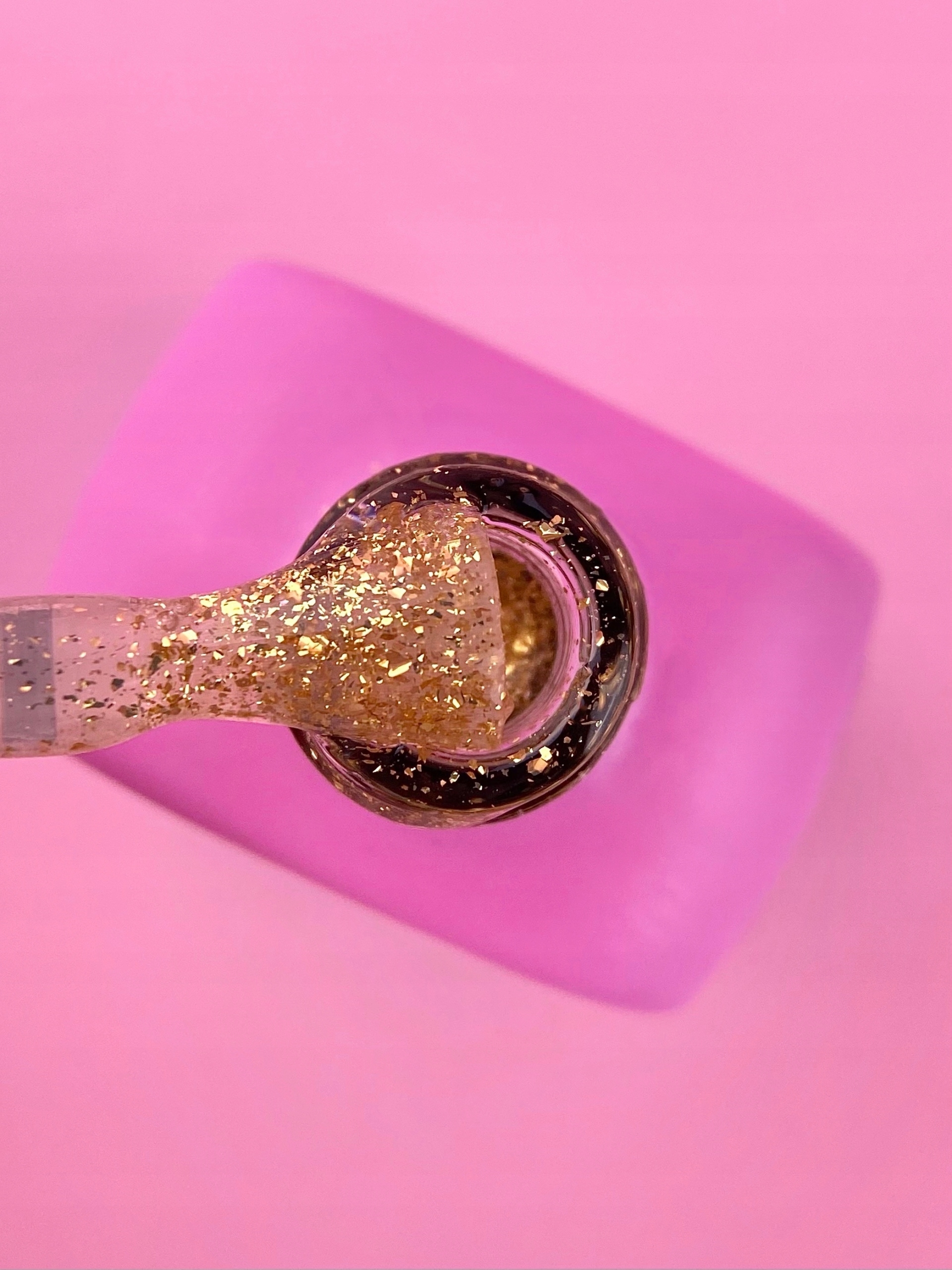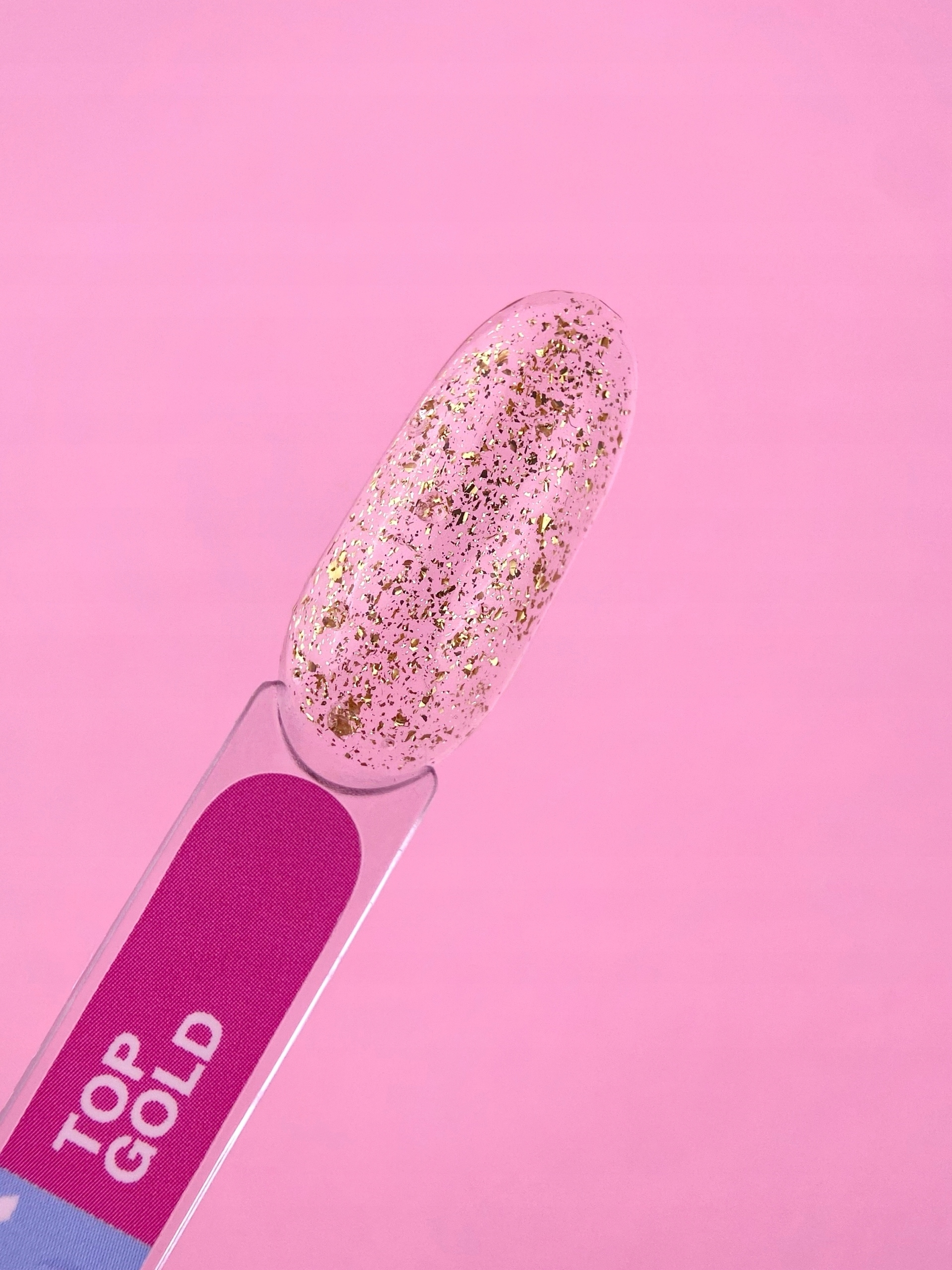 Top ze złotymi płatkami Luna Gold to top hybrydowy bez lepkiej warstwy, który będzie wyglądał harmonijnie z dowolnym kolorem na paznokciach.