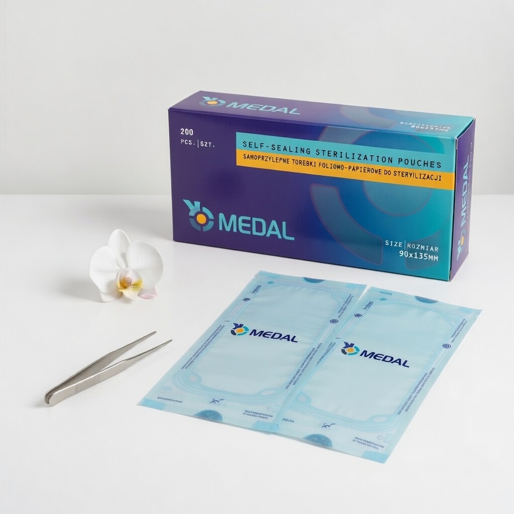 Profesjonalne torebki do sterylizacji Medal 90×135 mm przeznaczone do pakietowania narzędzi przed procesem sterylizacji w autoklawie parowym. Wykonane z wysokiej jakości papieru medycznego oraz przezroczystej folii barierowej zapewniają bezpieczne przechowywanie wysterylizowanych narzędzi w gabinetach kosmetycznych, podologicznych i medycznych.