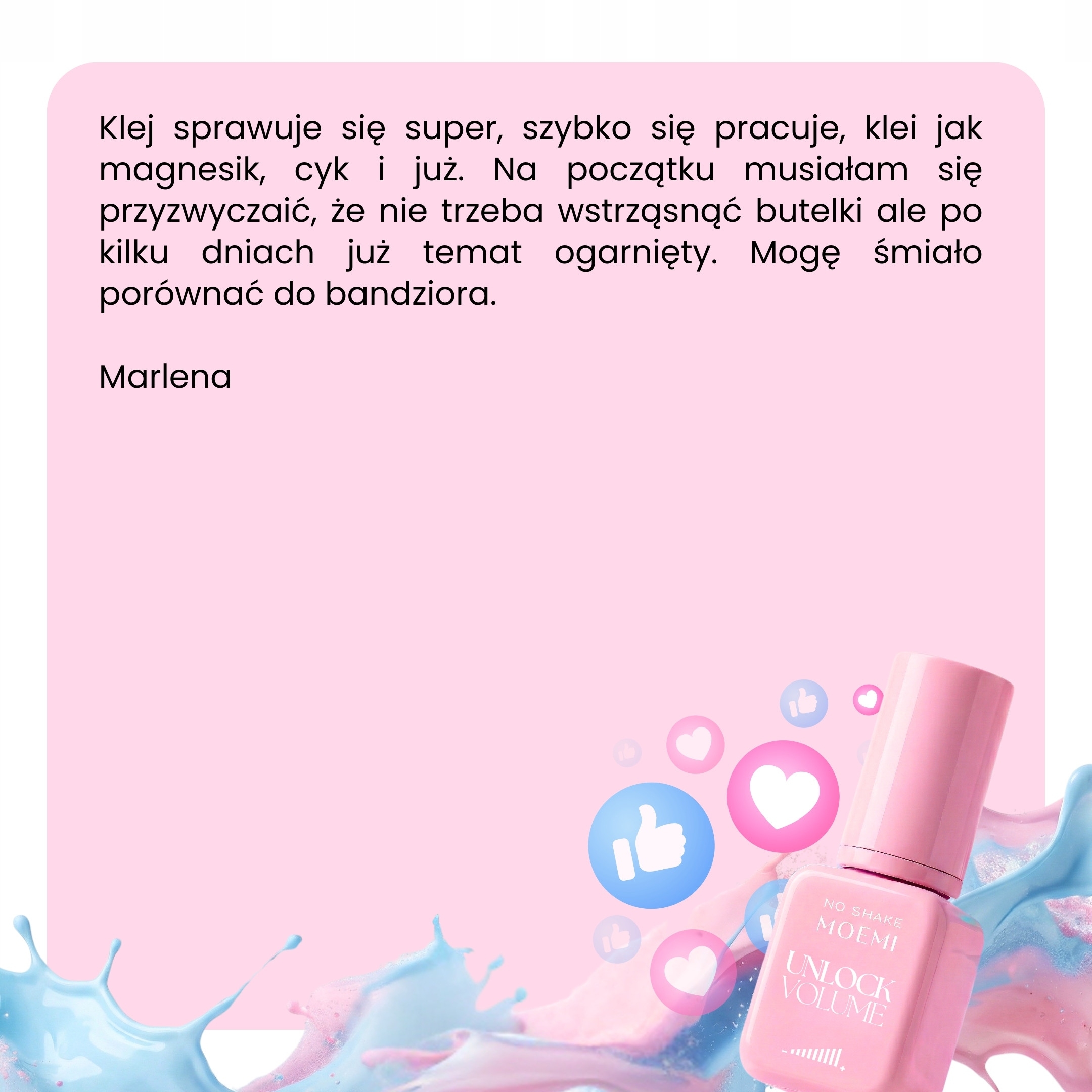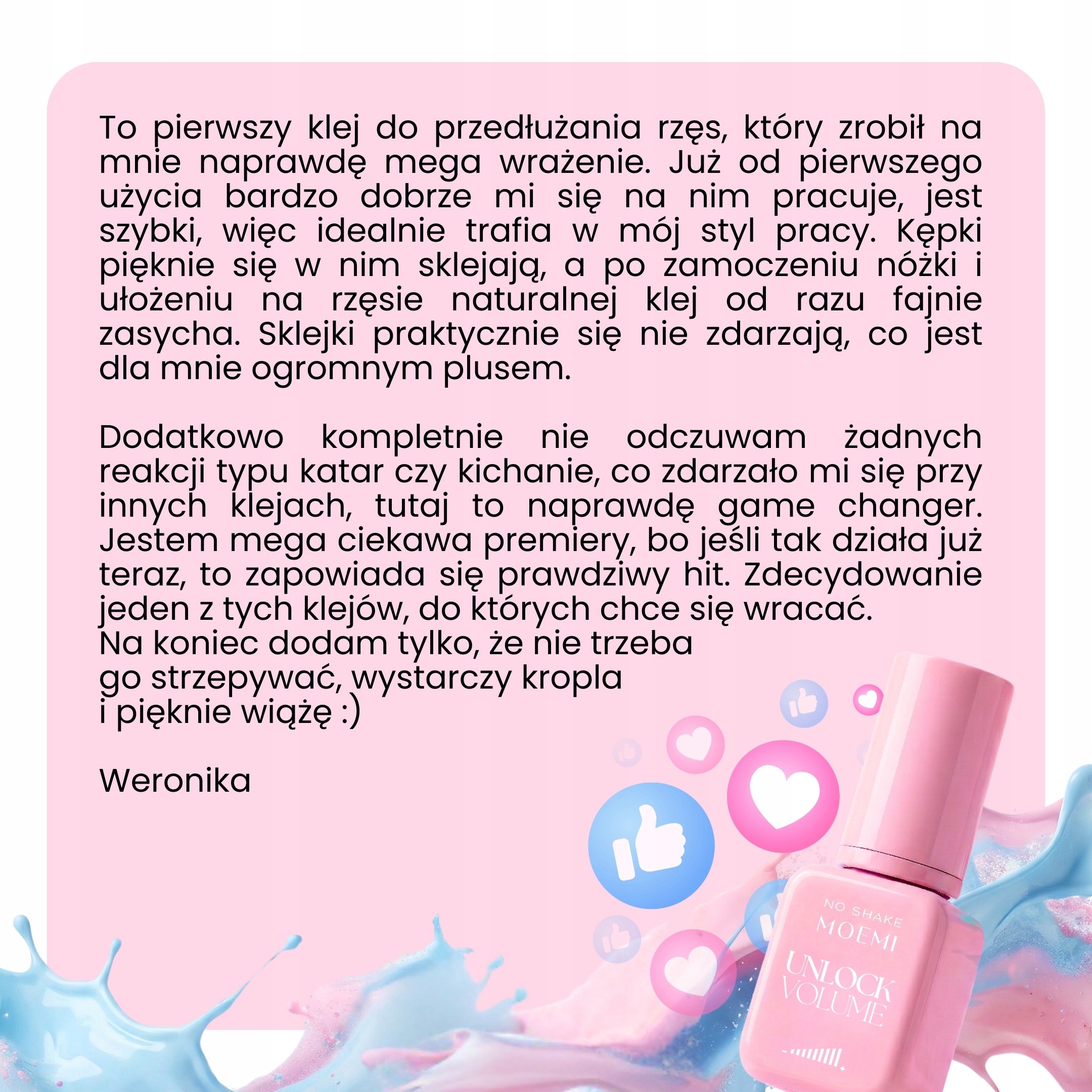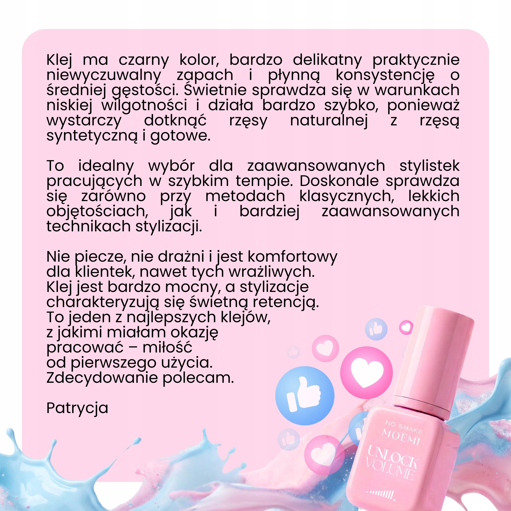 "To pierwszy klej, który zrobił na mnie mega wrażenie. Jest szybki, idealnie trafia w mój styl. Kępki pięknie się sklejają, a sklejki praktycznie się nie zdarzają. Dodatkowo kompletnie nie odczuwam żadnych reakcji typu katar czy kichanie - tutaj to naprawdę game changer."