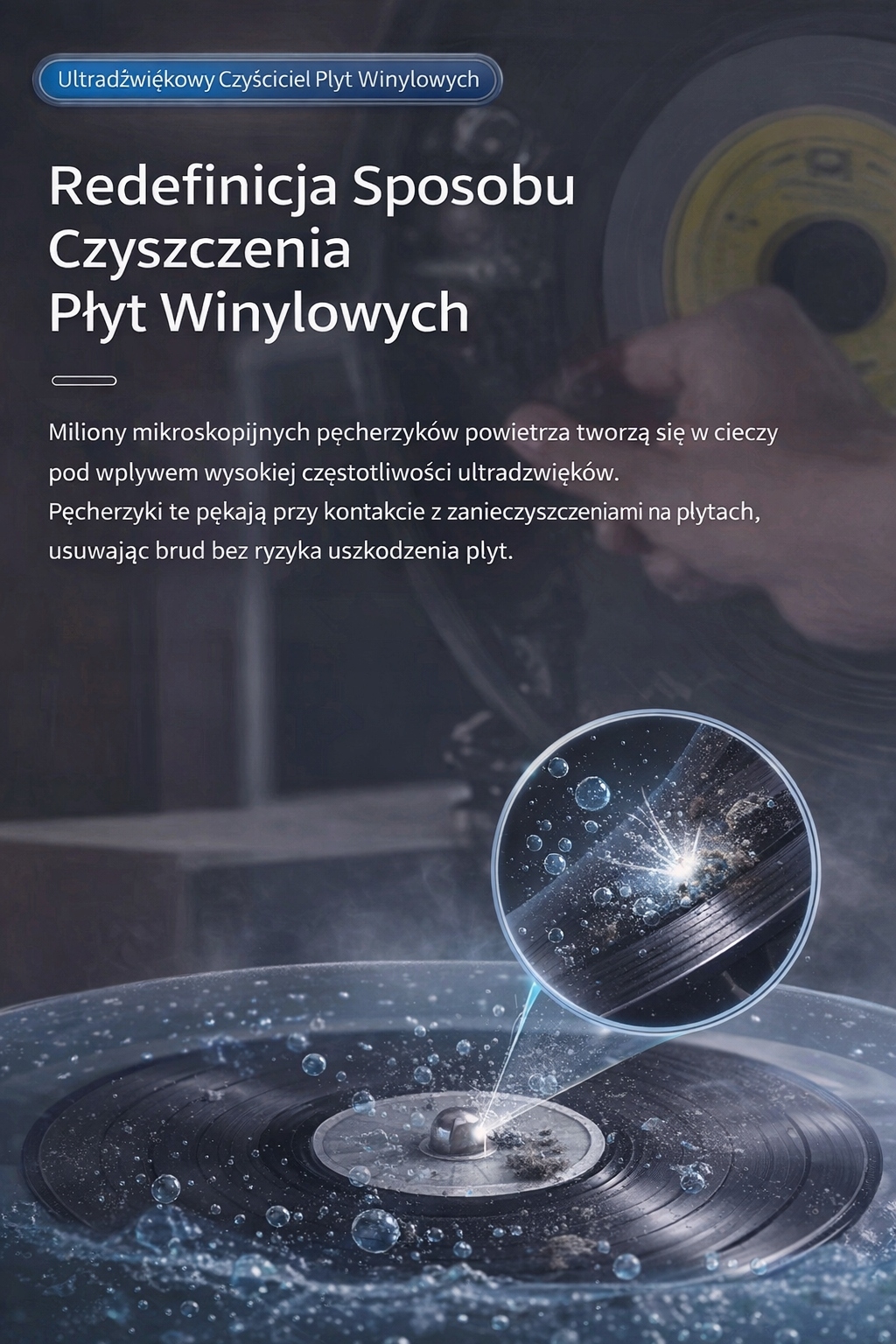 Myjka wykorzystuje fale ultradźwiękowe o częstotliwości 46–49 kHz, które wytwarzają w cieczy mikropęcherzyki. Ich implozja skutecznie usuwa zanieczyszczenia z głębokich rowków płyt winylowych, bez ryzyka uszkodzenia powierzchni.