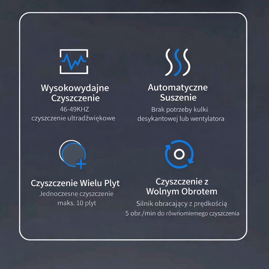 Zbiornik o pojemności 6 L (6000 ml) umożliwia efektywne czyszczenie kilku płyt podczas jednego cyklu. Komora wykonana ze stali nierdzewnej SUS304 jest odporna na korozję i zapewnia długą żywotność urządzenia.